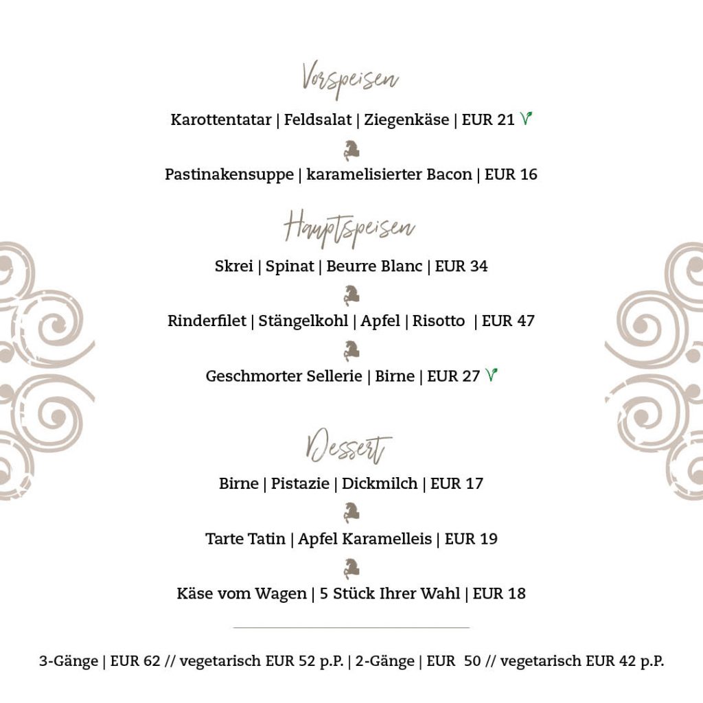 Freuen Sie sich auf kulinarische Highlights, die jeden Monat neu überraschen! Unsere Küche verwöhnt Sie mit saisonalen Menüs, die die besten Zutaten der jeweiligen Jahreszeit in kreativen Kompositionen vereinen. Ob frühlingsfrischer Spargel, sommerliche Beeren, herbstliche Kürbisvariationen oder winterliche Wildgerichte – wir bieten Ihnen Genuss auf höchstem Niveau.